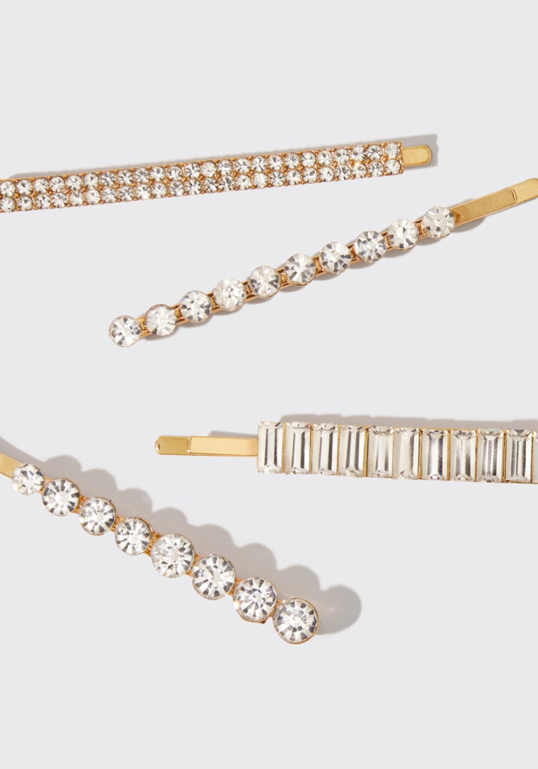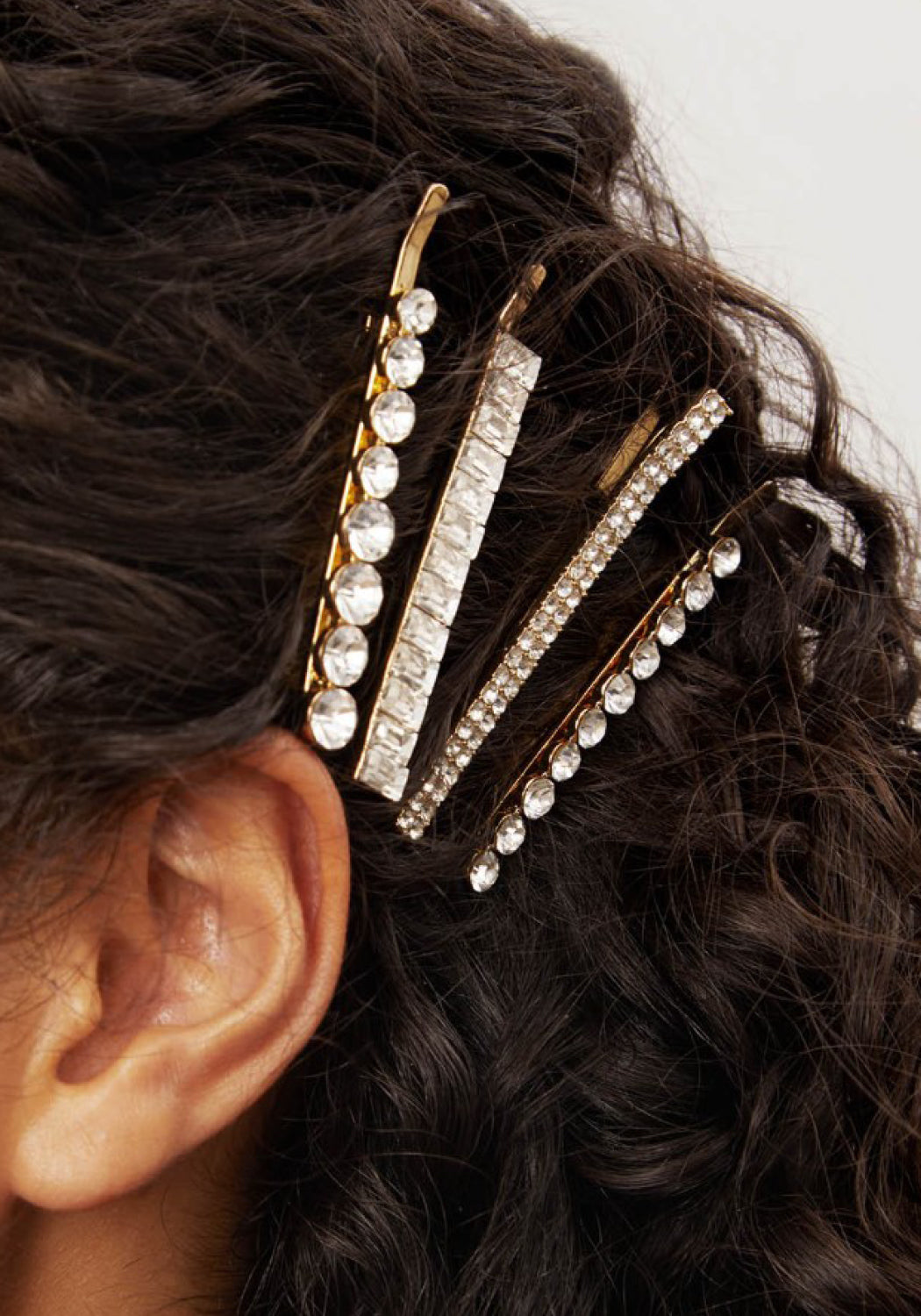 Accent your hairstyle with dressed-up gem pins featuring a touch of gold to elevate every look
