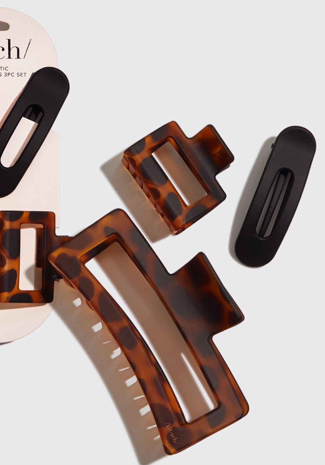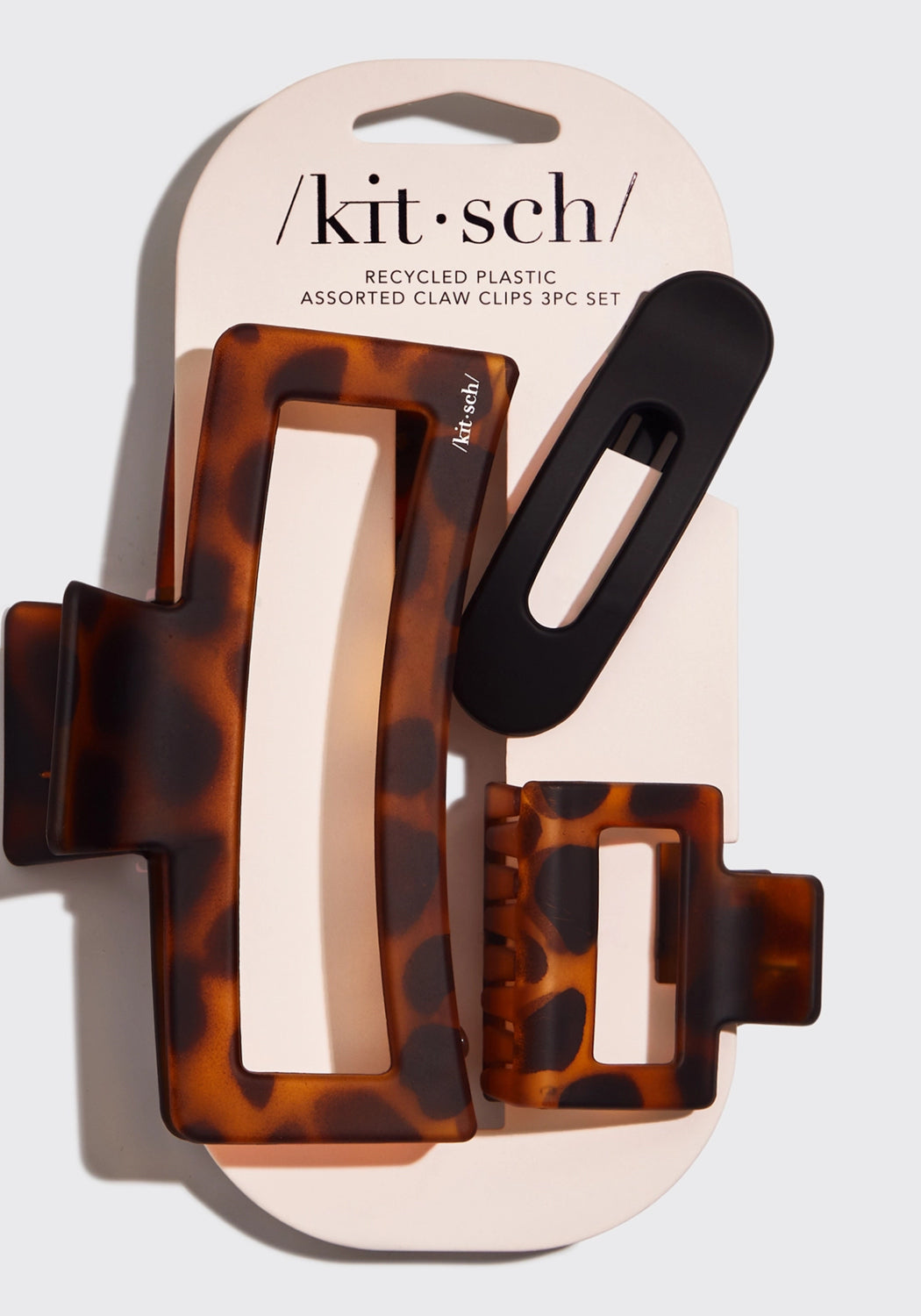 itsch Recycled Plastic Assorted Claw Clip Set features a trio of must-have claw clips in a variety of shapes sizes that let you set your style and elevate your look with ease. -Great for most hair types and lengths -Crafted from high-quality recycled plastic, making them sustainable and stylish -Include an oversized, open-shaped clip for twisting up and securing long, thick hair all day, a medium-sized open-shaped claw clip for an easy full or half-up look, and a small flat lay claw clip for securing bangs or twisting back your layers.