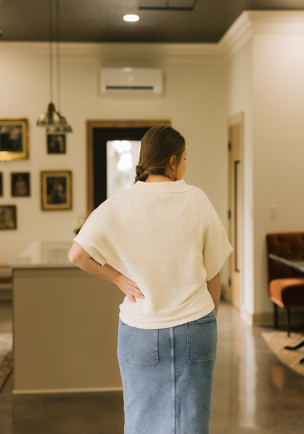 The 'Leanna' V-Neck Rib Knit Sweater is a timeless and effortless, this collared slub rib knit sweater is an instant favorite. Featuring a split neckline, dolman short sleeves, and a boxy fit, it balances structure with ease for a polished yet relaxed look. The soft cotton-viscose blend brings breathable comfort, making it a perfect transitional knit that carries from late summer into crisp autumn days.
