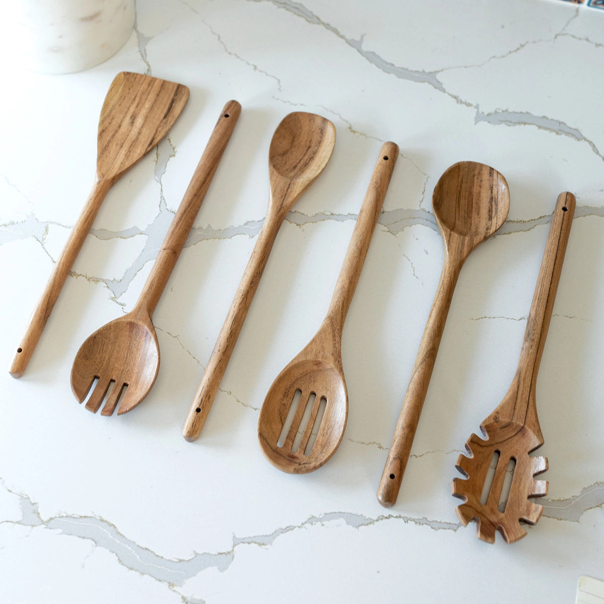 Elevate your kitchen decor with the Kendal Wooden Serving Utensils. This versa of six is perfect for serving or as everyday kitchen essentials. A thoughtful gift, these utensils add natural charm to all kitchens.