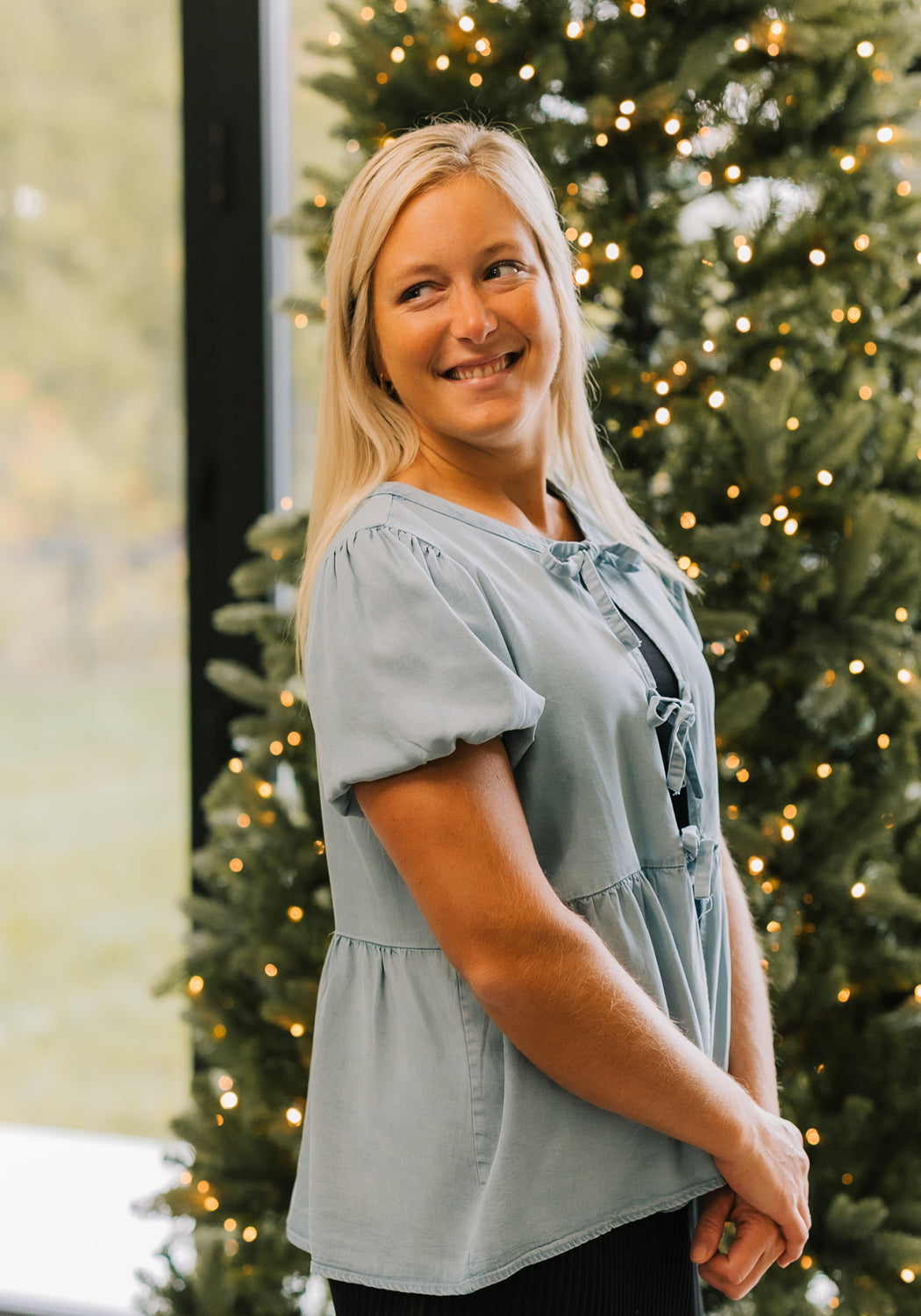 The 'Laura' Puff Sleeve Tie Front Top blends timeless texture with feminine detail, featuring classic patterns and softly puffed sleeves for a graceful silhouette. A versatile knit that transitions beautifully from casual afternoons to refined, modest gatherings.