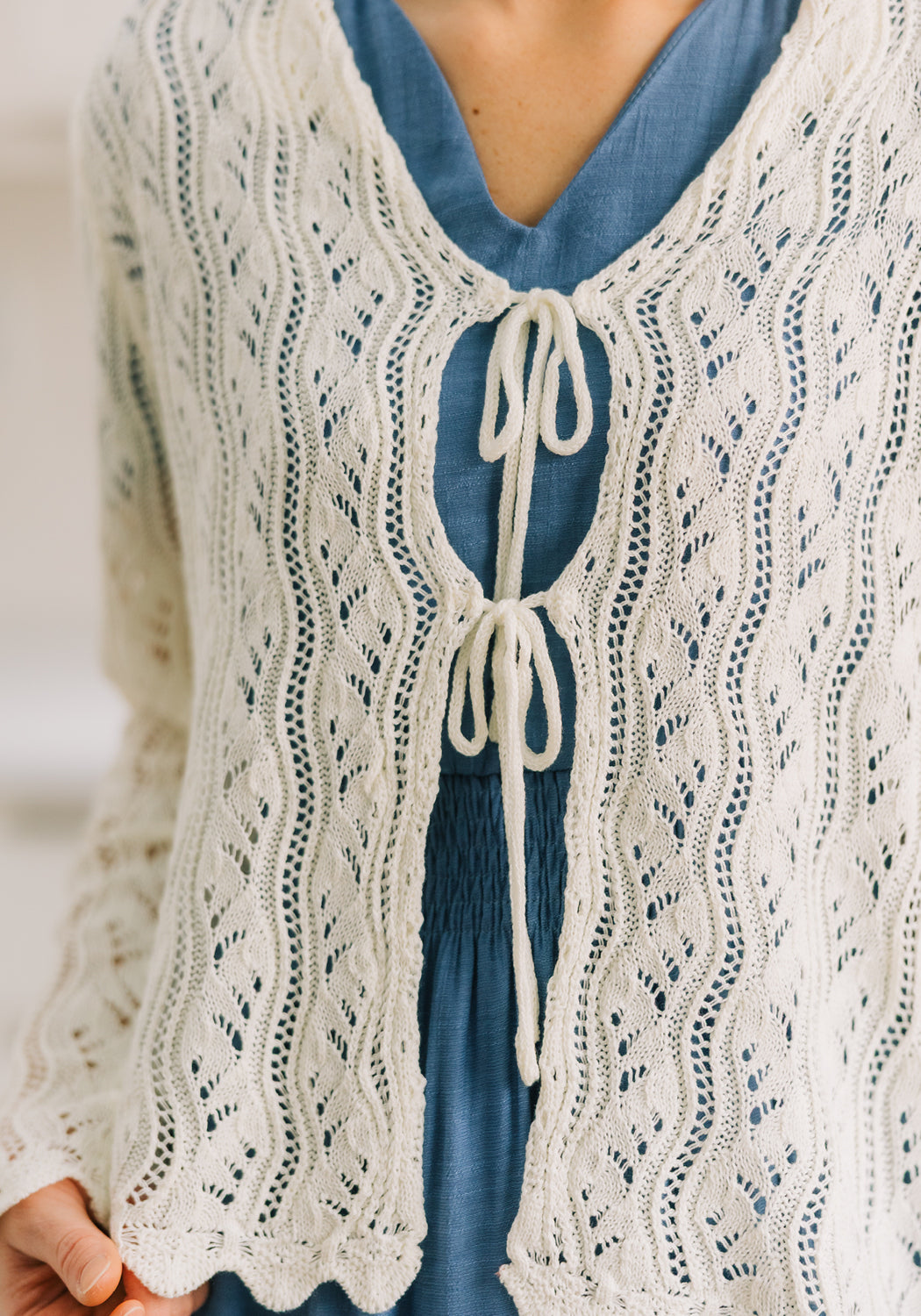 Crafted from soft cotton fabric, the 'Cordelia' Crochet Front Tie Sweater exudes a casual yet sophisticated feel that is perfect for any occasion. Whether you're strolling through the farmer's market on a sunny weekend morning or enjoying a brunch with friends, this versatile top is your new go-to choice. Pair with your favorite denim skirt and some comfy sandals for a casual day out or tuck into a flowy maxi skirt for a touch of sophistication.