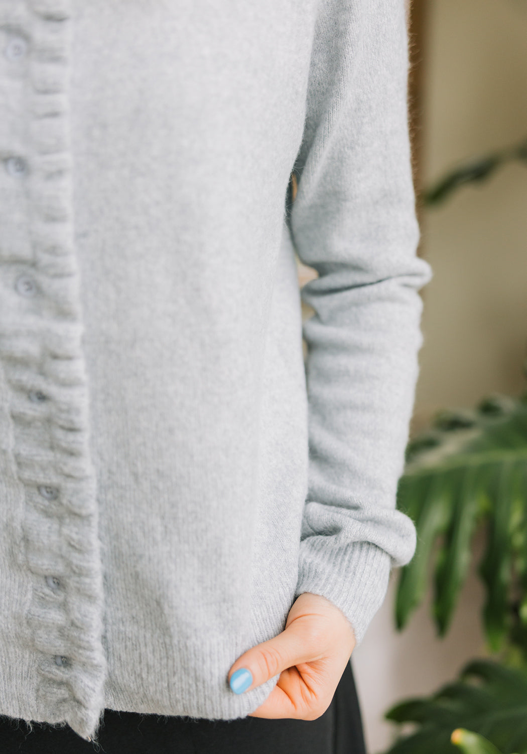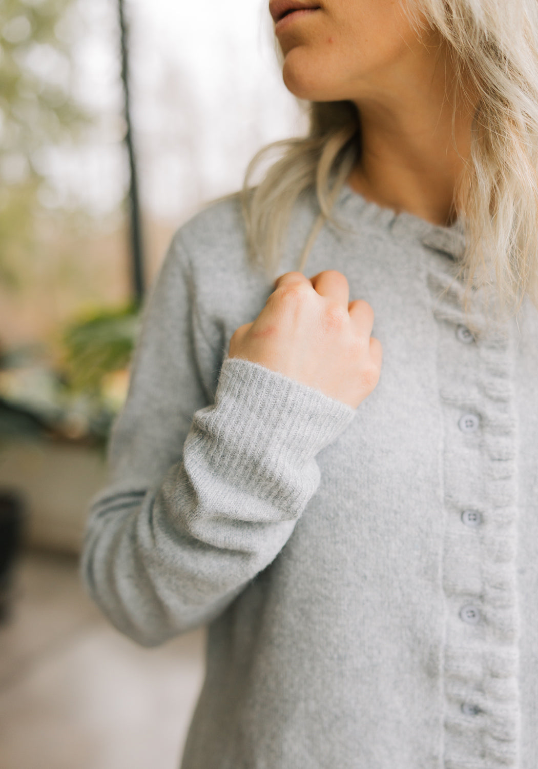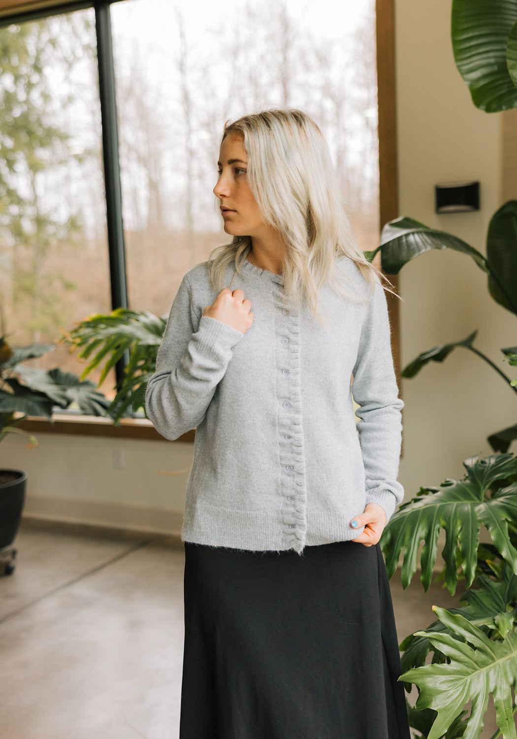 The 'Fern' Ruffled Button-down Sweater is a cozy layering piece that captures effortless grace and timeless modesty. Designed with soft stripes and button-front detail, it drapes beautifully for a relaxed yet refined look. Pair it with a flowing midi skirt or classic denim for everyday wear that feels warm, feminine, and grounded in simple, faith-filled living.