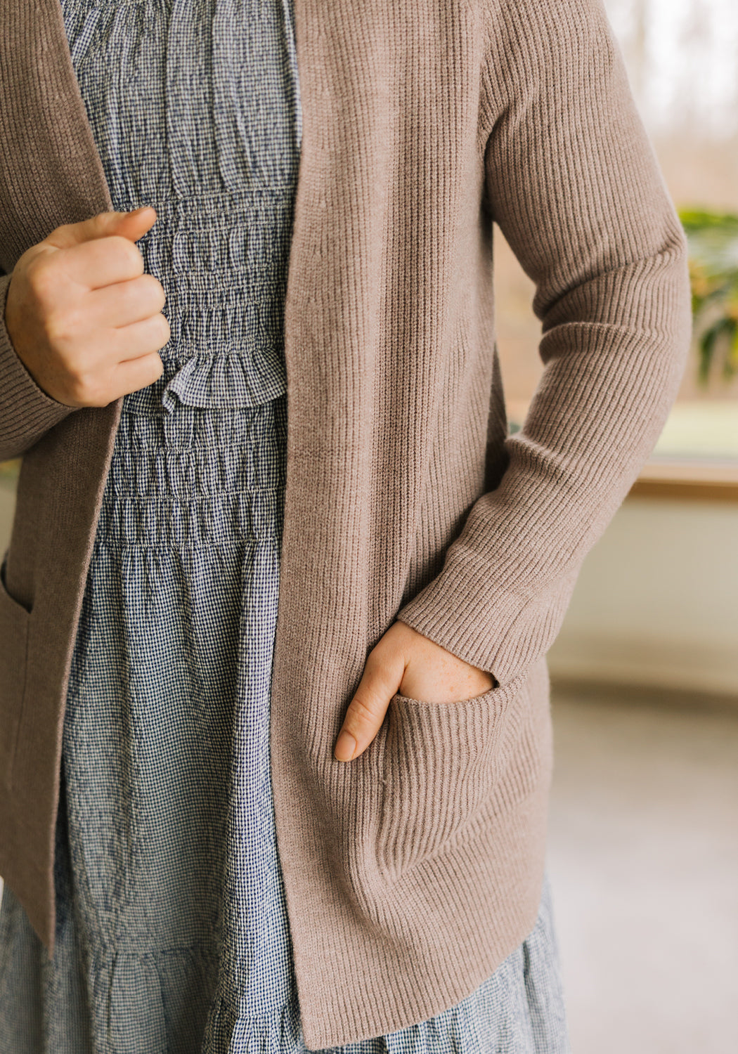 Meet the 'Hazel' Open Front Sweater Cardigan it brings all the cozy charm. Soft knit, warm caramel accents, and an easy open front make this piece one you’ll reach for again and again. The ribbed trim and pockets add that little touch of texture we love, while the lightweight feel makes it perfect for layering through every season. Effortless, timeless, and ready to pair with all your denim days.