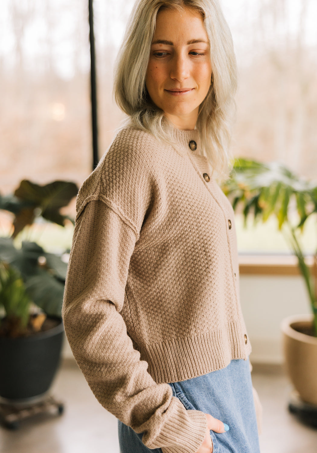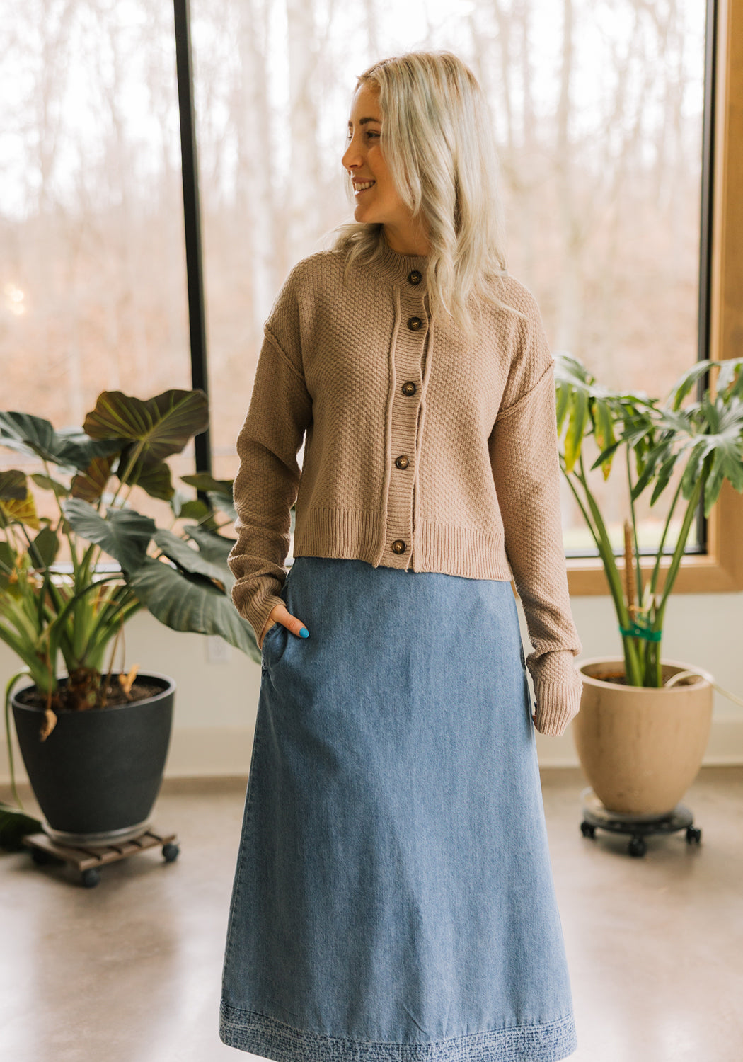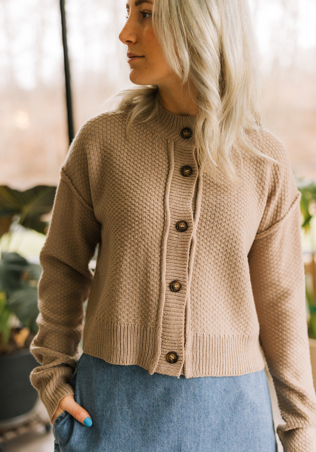 The 'Sylvie' Textured Button Front Knit Cardigan is a timeless layer that blends warmth and grace. Crafted in a soft coffee knit, it features classic brown buttons for a cozy, refined touch. Its modest fit and gentle texture make it perfect for pairing with a denim or corduroy skirt, bringing effortless femininity to cool-weather days.
