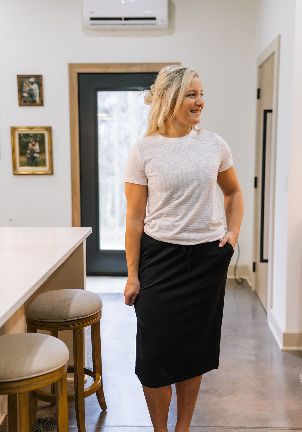 The Jordan Knit Midi Skirt blends comfort and function with everyday modest style. Designed with a stretchy fit, adjustable drawstring waist, and functional side pockets, it’s perfect for errands, lounging, or casual days. Available in five versatile shades, this wardrobe staple pairs effortlessly with your favorite layers for easy, flattering wear all year long!