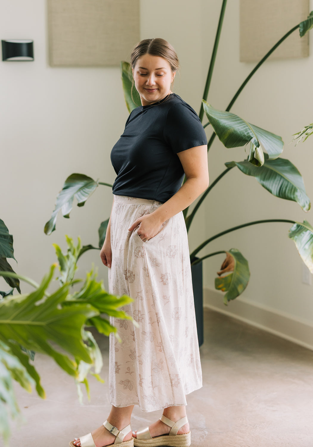 The 'Ruth' Victorian Midi Skirt is the perfect blend of comfort and class! Crafted from a cozy fabric, this skirt features a straight silhouette with a elastic waist for a customizable fit. A slit adds easy movement while keeping a modest, feminine look. Pair it with an Oversized Knit Sweater for a chic, coordinated outfit that’s perfect for both lounging and casual outings.