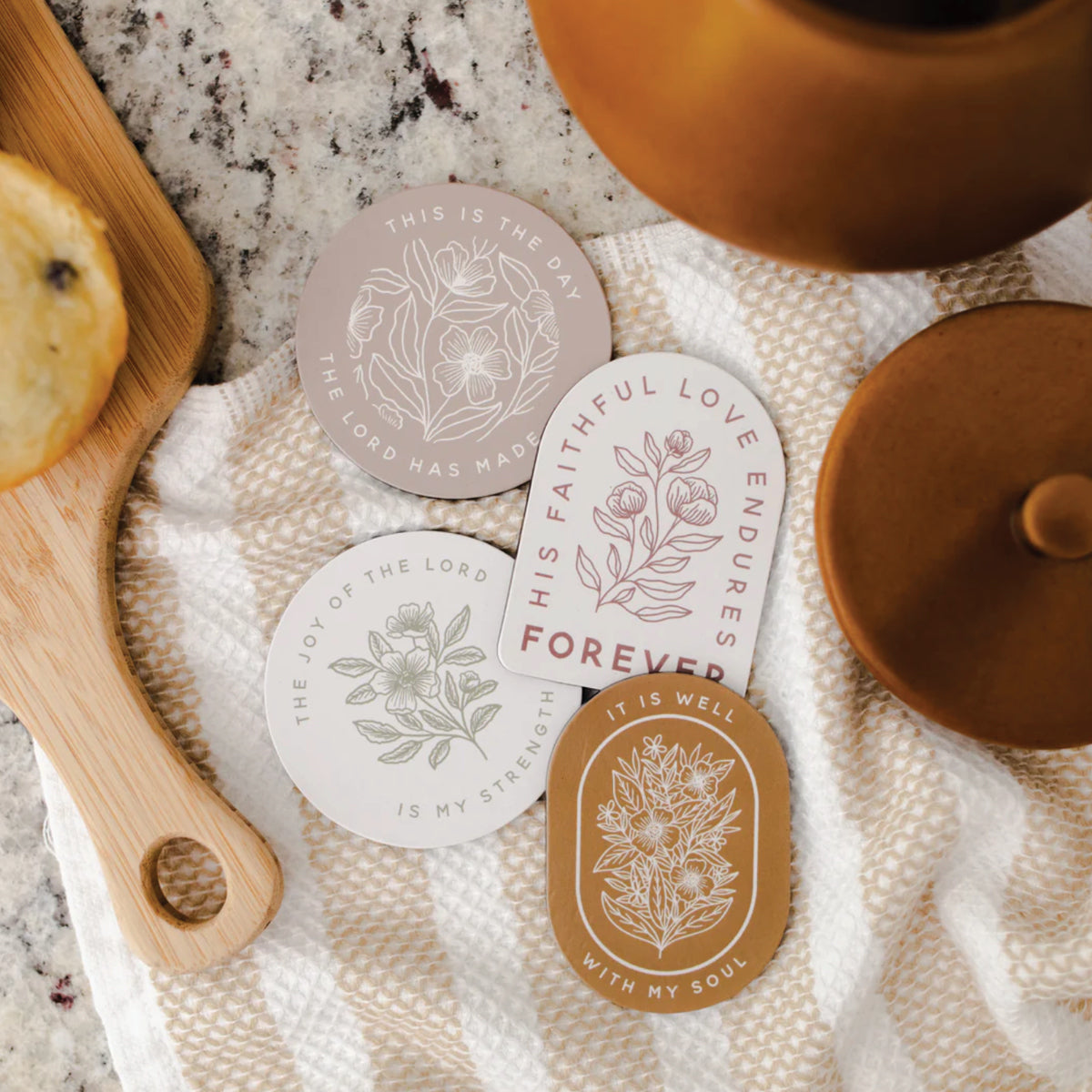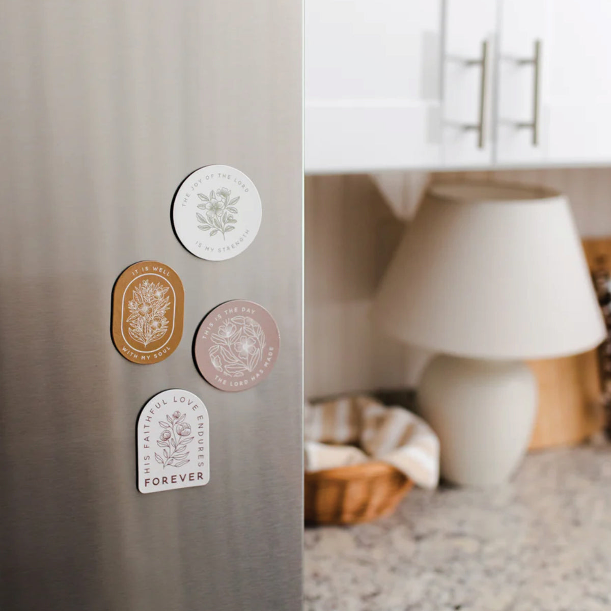 This set of 4 magnets features hand-lettered quotes such as “This is the Day the Lord has Made,” “His Faithful Love Endures Forever,” “The Joy of the Lord is My Strength,” and “It Is Well With My Soul.”